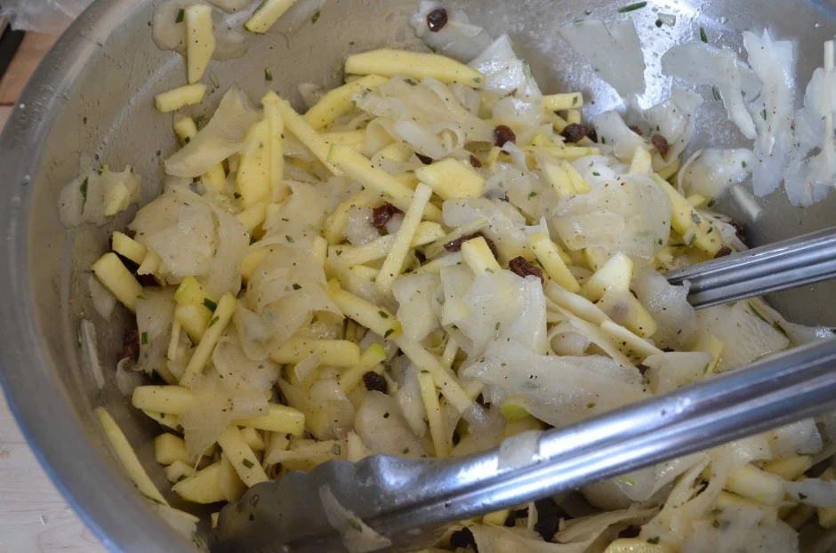 I kept it simple: radish, apple, rosemary (also local), a handful of raisins and a dressing of buttery olive oil, sharp cider vinegar, salt and pepper. Once stripped of their skins, the flesh of both black radish and green apple look strikingly similar. I shaved the radish (by hand, with a carrot peeler, not advised) and made matchsticks of the apple to provide a bit of visual contrast between the two salad partners. That was it! The salad had crunch and chew, sweet, tart, bitter and savory all at once. It was indeed, local, seasonal, and utterly affordable.