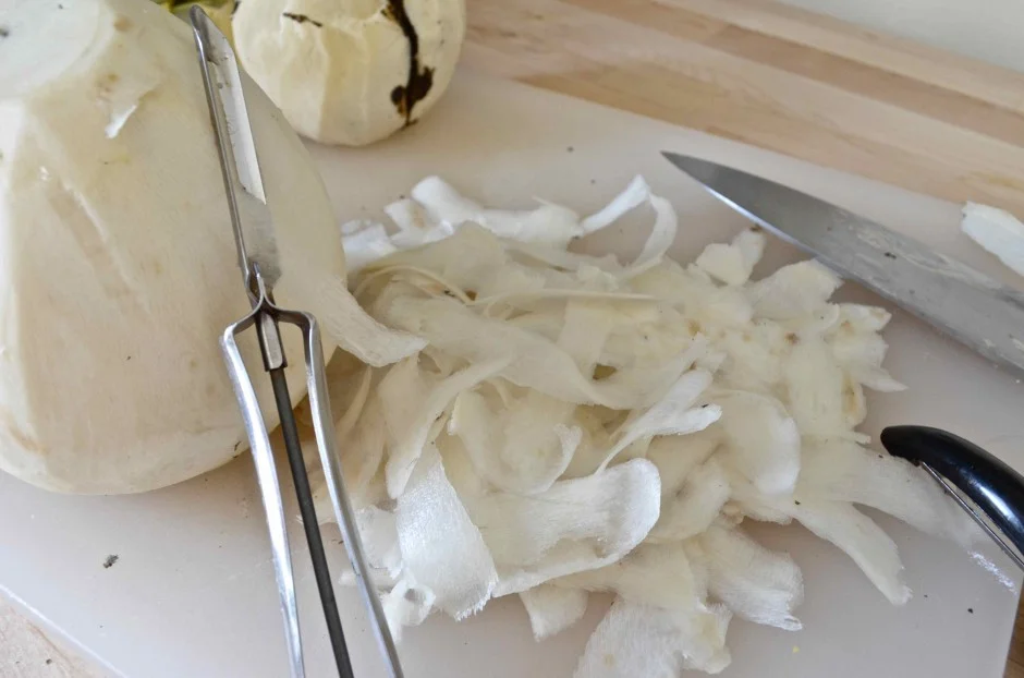 - Shave the radish into ribbons. I used a carrot peeler and the event took mindless ages. I was rewarded with delicate ribbons, but in the future I might use the shaving attachment on my food processor. Do as you like.