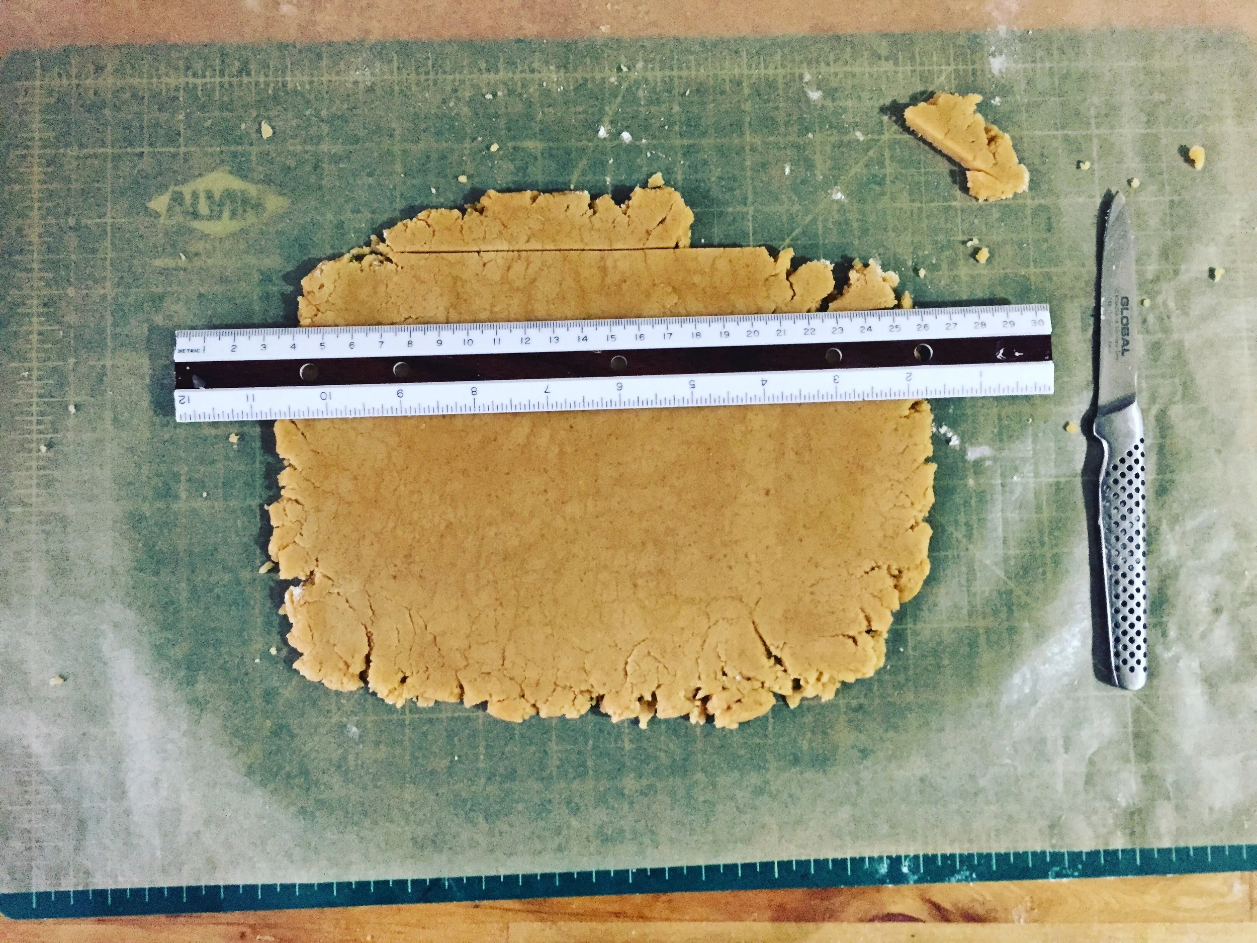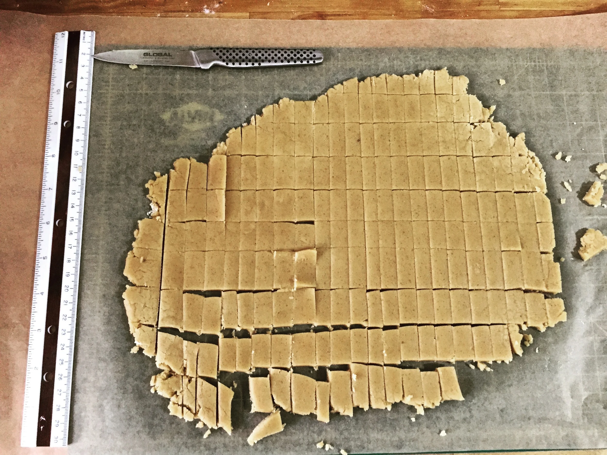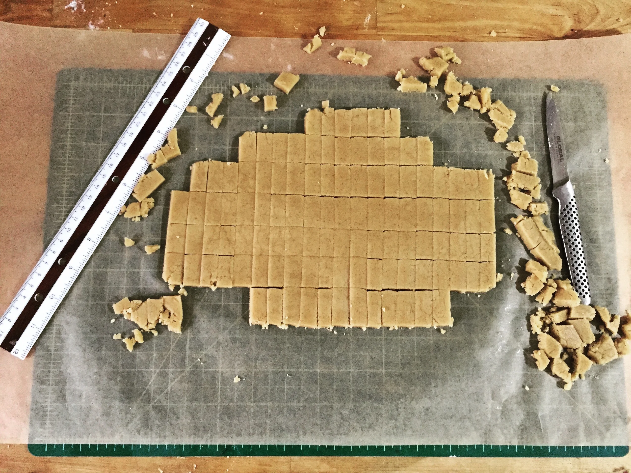 The traditional format for building a gingerbread house is to draw a pattern on paper, then cut those pieces out of a large sheet of gingerbread. But that offers you the equivalent of sheets of dry wall when it comes to construction. They aren’t very stable, and they’re hard to hold up. We tend to jam them into thick moldings of icing and frosting just to get them standing. It’s all nonsense. We’ve had a perfectly sound solution in the toy cabinet for years! Legos are designed on the property of simple structural engineering. Certainly, they lock together, but even if they didn’t, the notion that bricks stacked on top of each other are strong is not a new concept. I recommend cutting your sheets of raw gingerbread into as many little bricks as possible.