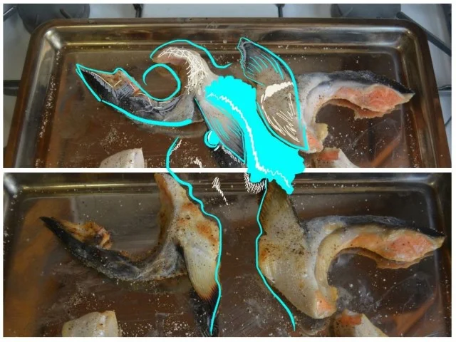 If you do come home with whole fish heads, cut the collar off (the bit at the end of the head, a few wing shaped pieces), then take a cleaver and split the heads from nose to neck. Heat your broiler until it is screaming hot, hotter than you think wise. Salt and pepper the fish bits to your liking, place them skin side up on a roasting tray and slide them into your oven/broiler just a few inches away from the heat. The skin will crisp up in 4-8 minutes, and the flesh will still be tender.