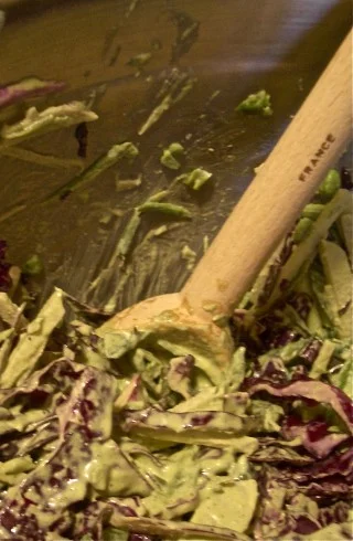 Which is how I ended up making slaw and falling in love with a food I had blacklisted as a kid. I sliced a head of jicama into matchsticks, did the same to some red cabbage, rough chopped a bunch of sugar snap peas and sliced some scallions, mixed it all in a giant bowl (I was cooking for ~45) and dressed it with the cilantrayonnaise. It was delicious. Cool, crisp and juicy, it was the ideal side dish.