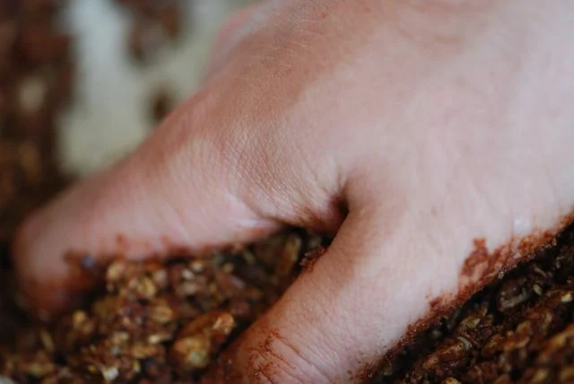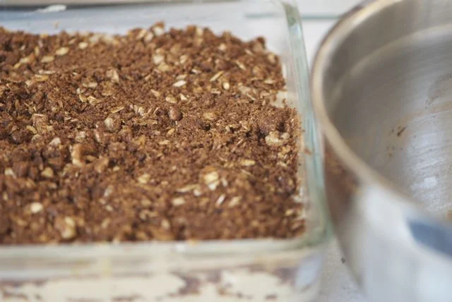 - Combine the remaining topping ingredients in a bowl with the cooled pecans and oats. You will be making delicious dirt, get your hands in there and love the topping.