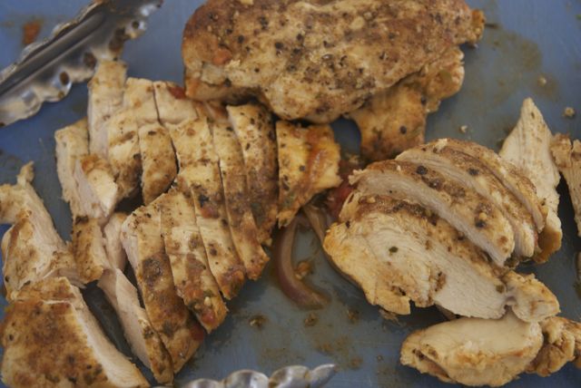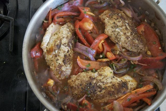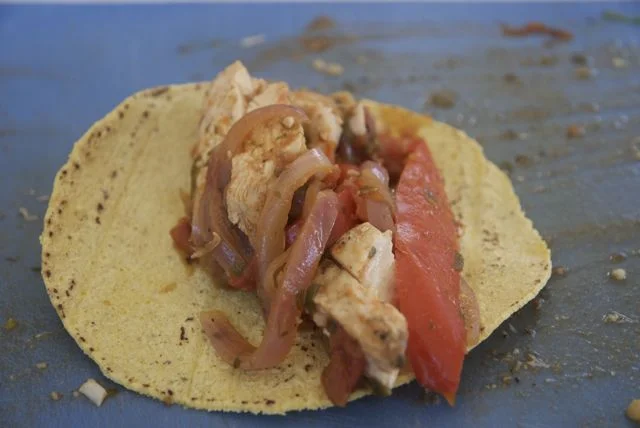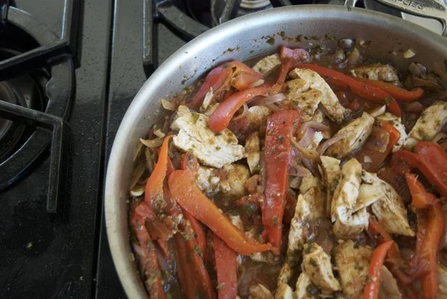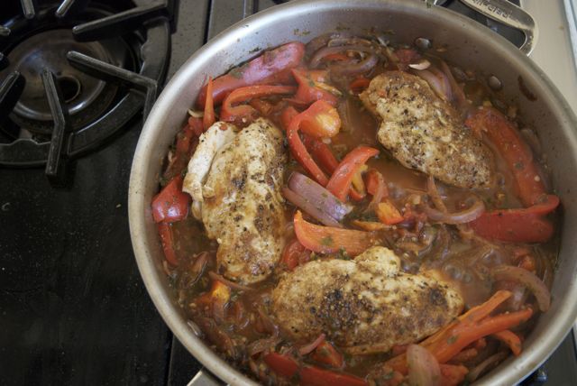 7. You can eat the dish now, but the whole breasts will be hard to stuff into tortillas. So take the chicken out of the pan and slice it into strips. Mix the chicken strips back into the peppers and onions and you’re all set. Put up your feet, it’s been a long day.