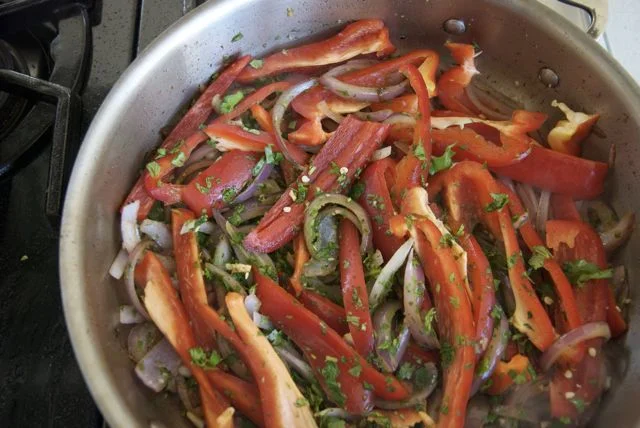 4. It’s time to add the bell peppers. Toss them into the onions along with the chopped cilantro. your skillet should look like a carnival. Color=flavor+health.