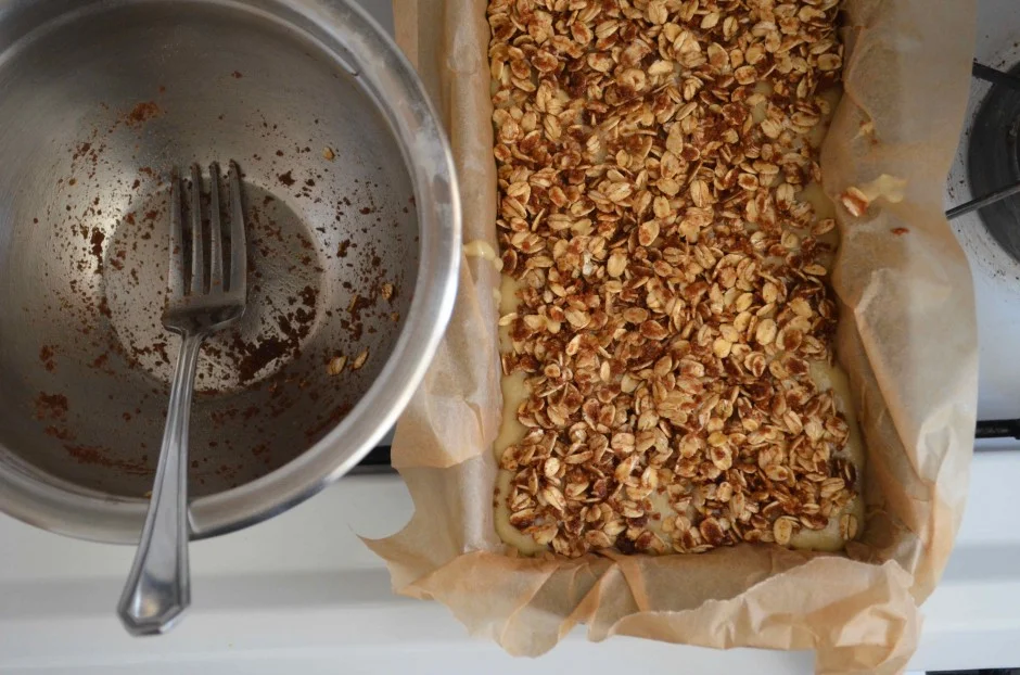 I started with Rosh Hashanah as inspiration, baking a traditional honey cake for a small dinner party. Unfortunately that first batch was dry as matzoh and heavy as a brick the next day. Back to the drawing board. I took a note from my banana bread (effortlessly moist) and added some fruit puree to the batter. Bananas would be delicious but utterly unseasonal so I stuck with apple sauce. It worked perfectly and the cake is now publishable. To stave off a potentially cloying cake I added some ground cardomom to the batter and topped the whole thing with toasted oats and cinnamon. It rocks.