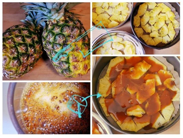 - Scatter the pineapple in the bottom of a parchment lined 9-inch springform pan. Pour the caramel over the fruit.