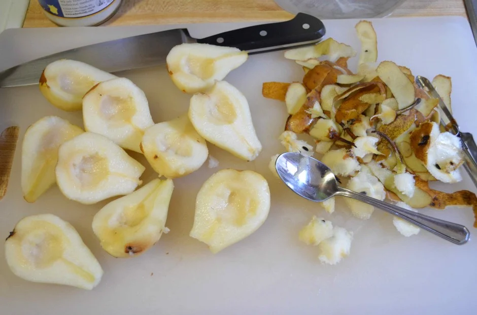 1. Halve the pears, scoop out their seeds and stems. Maybe peel them, maybe don’t.