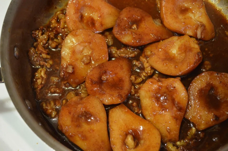 2. Place the pears cut side down in a large skillet. Sprinkle your sugar over the fruit, if the fruit is super ripe maybe you don’t need too much? Scatter a few pats of coconut oil or butter over the pears. Shake some cinnamon into the skillet, toss in the walnuts, add the salt.