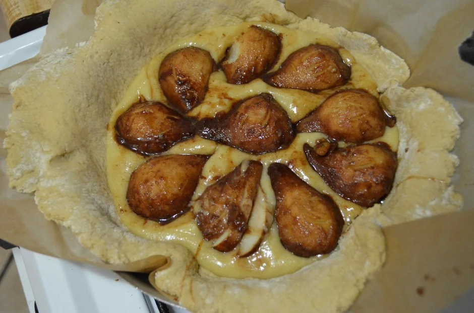 10. Spread the frangipane into the dough. Place the pears and any remaining caramel (from cooking the pears) into the frangipane. Fold over any dough you have hanging over the edge of your pan.