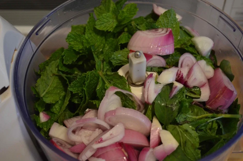 - Add the first 6 ingredients to a food processor (everything but oil, salt and pepper). Buzz until all the ingredients are finely chopped.