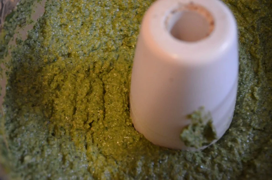 - With the processor still buzzing, slowly stream in the olive oil. The veggies and nuts will come together in a fine paste now.