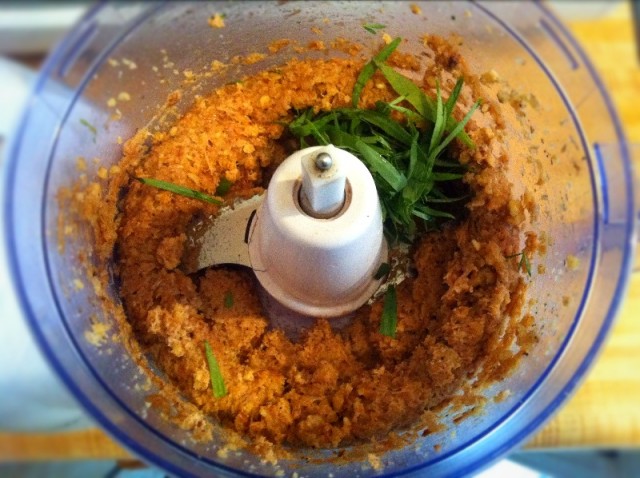 - Put the caramelized onions in your food processor with the nuts, tomato, tarragon, 1/4 cup oil, anchovies, lemon juice, salt and pepper.