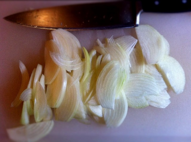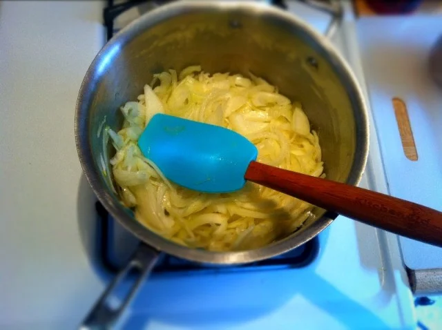 - Slice the onions as thin as possible. Put them in a sauce pan over medium heat with 2 tablespoons olive oil and 1/2 teaspoon salt. Stir them every few minutes until they are golden and gooey. They should reduce to roughly one cup. You’ll know they’re done when the house smells like France.